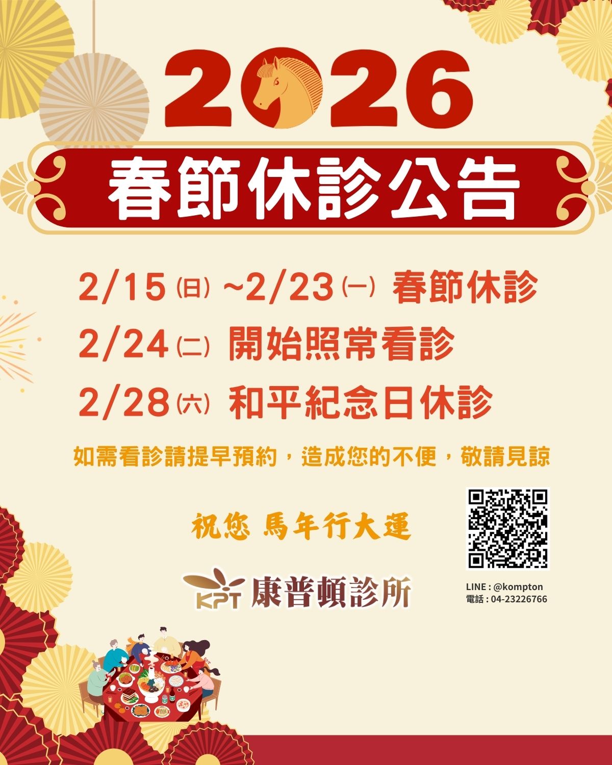 2026/2/15-23春節休診,2/24(二)開始照常看診, 2/28休診一天