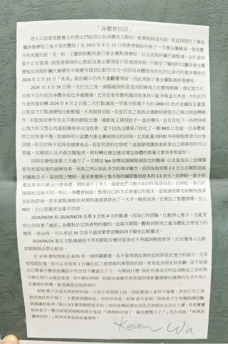 2024 年3月28日第一次打完之後,頭腦感到相當混沌眼睛視力也變得模糊,連記憶力也出現不足的狀況身體各部位多處酸痛,尤其是曾有舊疾處回家後我只能多喝溫水休息。大約於四天後恢復好轉2024年4月2日第二次打點滴我一早就分批喝下大約1800 CC的水並攝取足量蛋白質這次打點滴療程比較輕鬆,不再頭昏目眩,但是打完之後我去運動時發現自己無法做旋轉動作,若勉強則會有失去平衡的瞑眩反應。運動後又發現肚子一直咕嚕叫,並且在吃下一些甜時候心情大好又想去找蛋糕糖果好在沒找著,當下因為沒糖果只好吃了一顆NEO口含錠,但身體竟然立刻恢復平衡,我頓時明白當體內重金屬被排出的同時,尤其能量消耗較多時細胞會發出討食訊號,而且討得不見得是健康食品,而是邪惡的垃圾呢!這個發現讓我重新拿出之前庫存的天山雪蓮,在睡前以及早晨空腹服用,將好轉反應加速並增加身體的微量元素效果相當好。