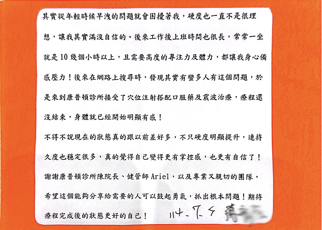 40歲的貴賓陳先生長年有早洩困擾,硬度也不理想,長期缺乏自信。工作後壓力大、久坐又疲勞,更加劇狀況。到康普頓診所,接受穴位注射、震波與口服藥療程,療程未完就已明顯改善。現在不只硬度提升,早洩功能提升100%,整體更有掌控感與自信,感謝專業團隊協助,期待更好的自己!