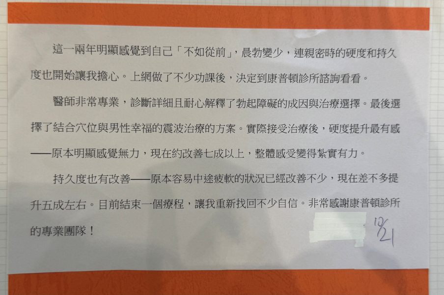 持久度也有改善——原本容易中途疲軟的狀況已經改善不少,現在差不多提升五成左右。目前結束一個療程,讓我重新找回不少自信。非常感謝康普頓診所的專業團隊!