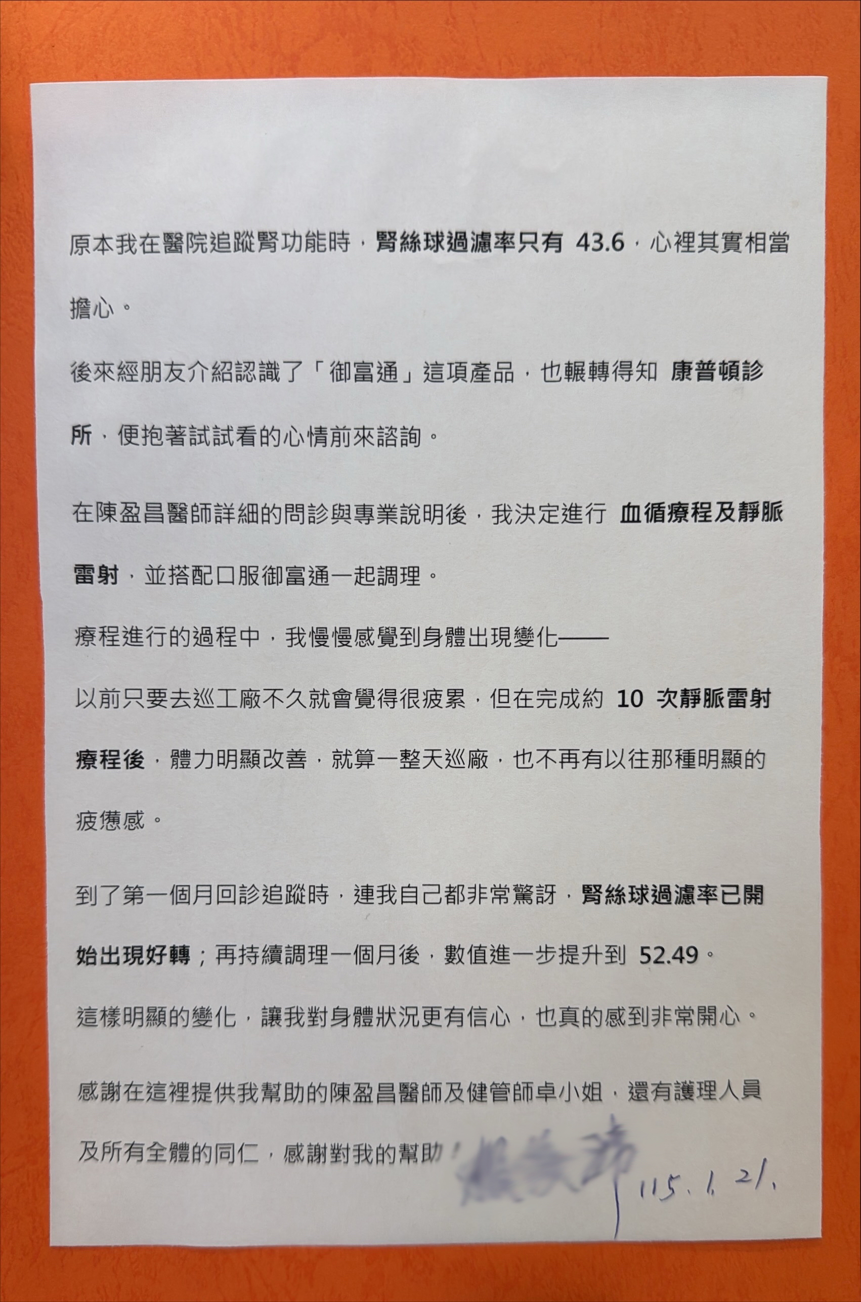 原本我在醫院追蹤腎功能時,腎絲球過濾率只有 43.6,心裡其實相當擔心。