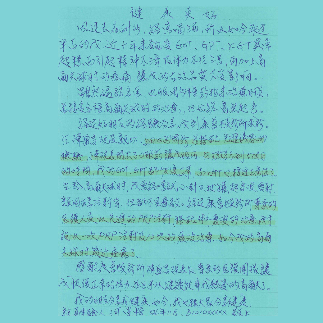 感謝康普頓診所陳盈昌院長及專業的醫護團隊,讓我恢復正常的體力,並且從事我熱愛的高爾夫了。