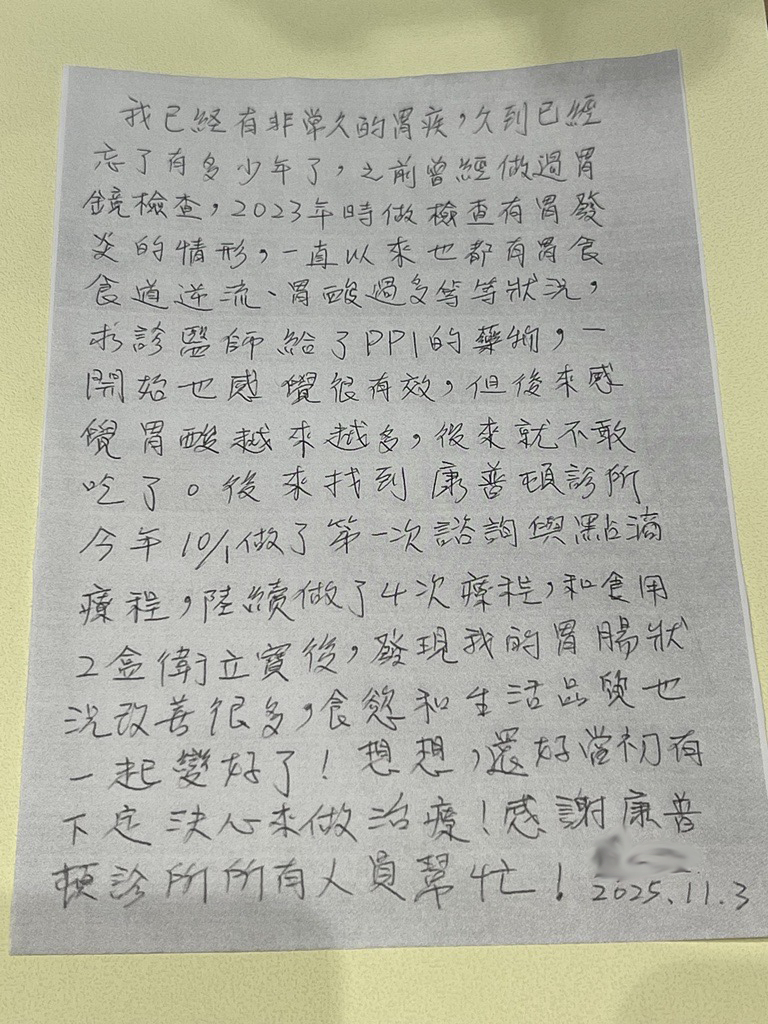 我已經有非常久的胃疾,久到已經忘了有多少年了,之前曾經做過胃鏡檢查,2023年時做檢查發現有胃發炎的情形,一直以來也都有胃食道逆流、胃酸過多等等的狀況,求診後醫師給了PPI(質子幫浦抑制劑 長效型制酸劑)的藥物,一開始也感覺很有效,但後來感覺胃酸越來越多,後來就不敢吃了。找了很久找到了康普頓診所,一開始也因為諸多因素從去年年底一直觀望,遲遲沒有來求診,一直到今年9月的時候才下定決心要來這裡試試看!10/1做了第一次諮詢與點滴療程,陸續做了4次療程後和食用2盒衛立寶後,我發現我的腸胃狀況改善很多,食慾跟生活品質也一起變好了!想想,還好當初有下定決心來做治療,才讓我找到人生的另一條路!感謝康普頓診所所有人員幫忙!