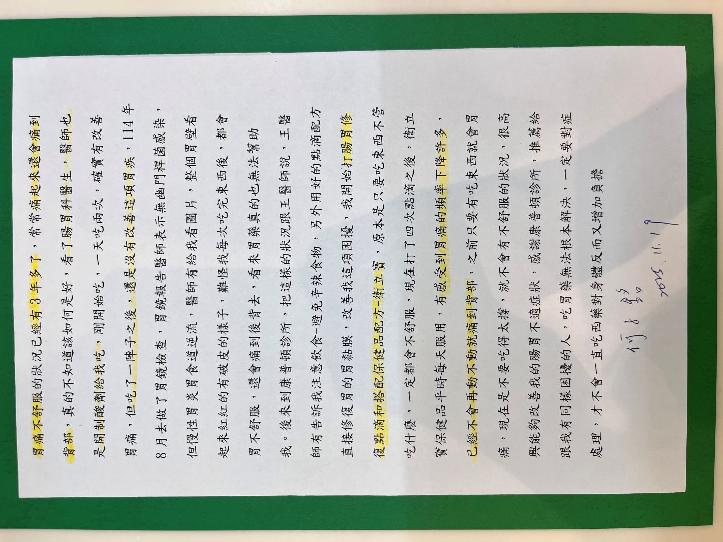 何先生胃痛困擾三年多,吃胃藥只能暫緩,經4次腸胃修復點滴與"衛立寶"保養後,胃痛頻率明顯下降,吃東西也舒適許多,真正改善腸胃健康。