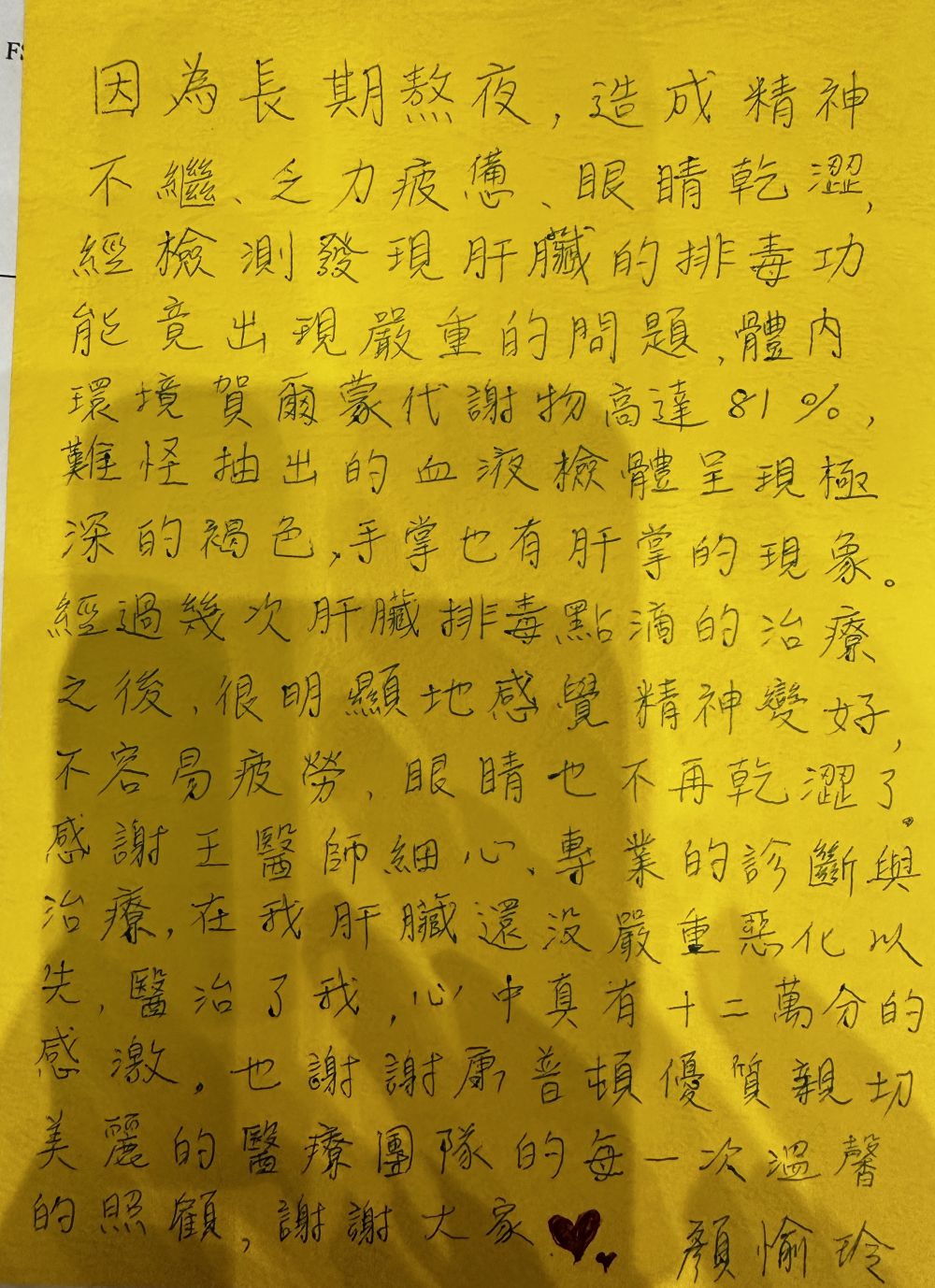 經過幾次肝臟排毒點滴的冶療之後,很明顯地感覺精神變好,不容易疲勞,眼睛也不再乾澀了。