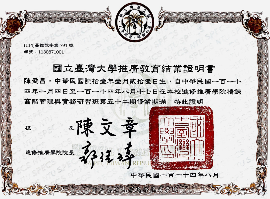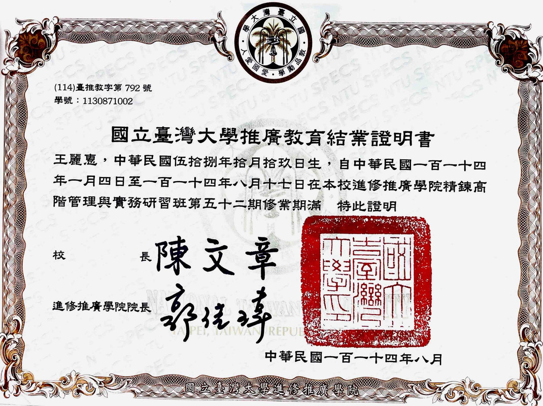 這一次,陳盈昌醫師、王麗惠醫師,在繁忙的醫療工作之餘,依舊選擇投入寶貴的時間與精力,參與 國立臺灣大學進修推廣學院第52期「精鍊高階管理與實務研習班」。歷經多月扎實的學習與挑戰,終於在 2025 年 8 月順利修業期滿,榮獲結業證書。